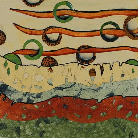 She creates collage papers making monoprints, using acrylic paints with stencils, masks, lines, stamps and textures. Her work is a process of layering these and other papers with acrylic paints on canvas, or paper. Following the layering, a process of excavating through the layers, and adding transparent layers begins. Eventually a balance and dimensionality emerges in the work. Her most recent art was reviewed:” I like the geometry, the spaciousness, simplicity, and “reach” of the design. It is expansive, yet contained…bold, yet relaxed.”