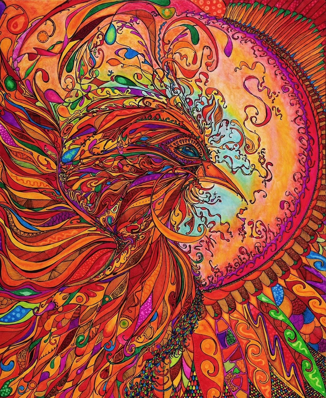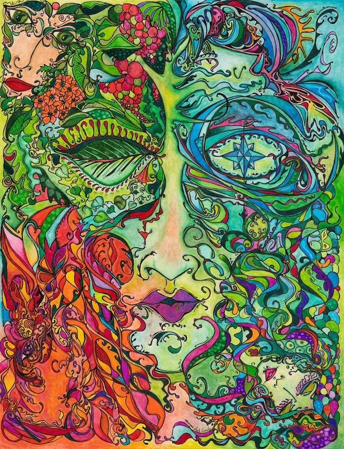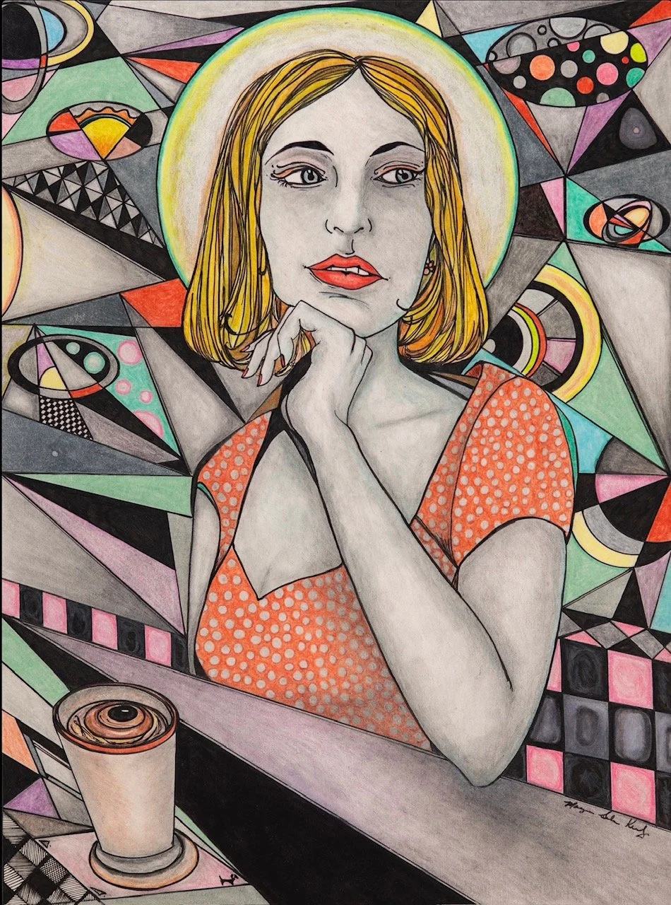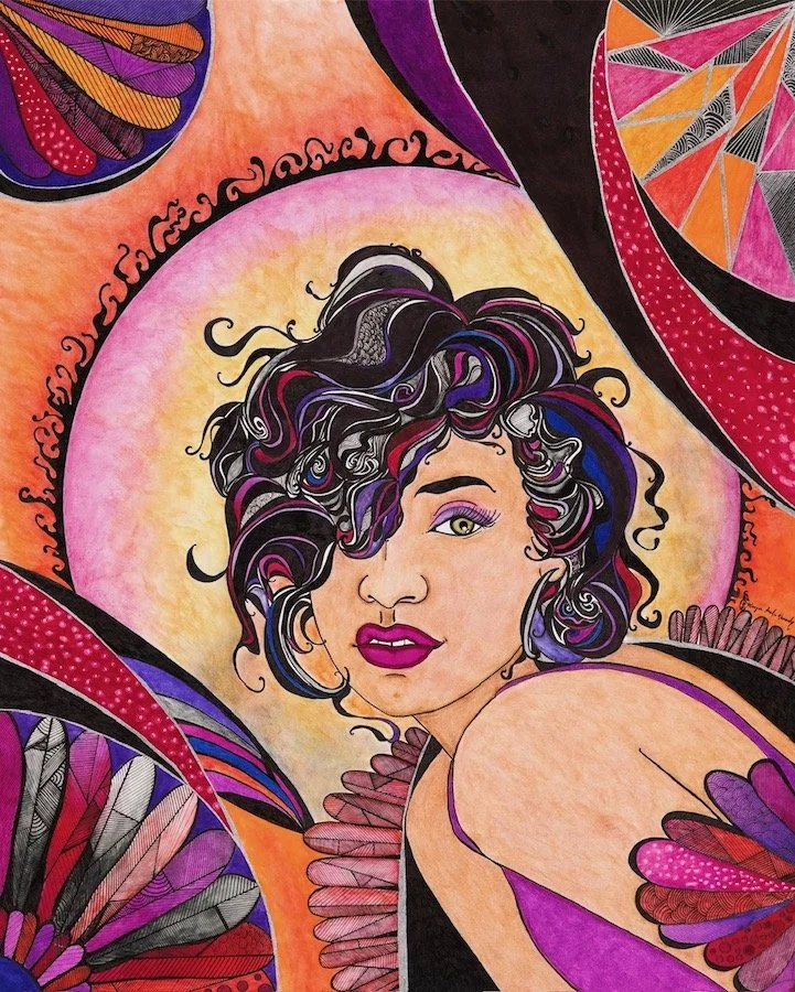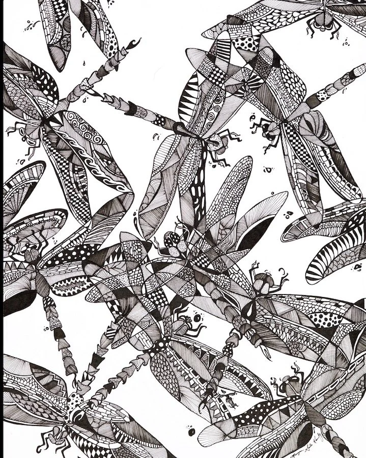 Her work begins with a pencil sketch on paper, followed by a pen outline, then color, and a constant repetition of layers, textures, and small details. Some drawing take up to three months to complete. While her work is time-consuming, Maegan believes that the details add a rewarding complexity to her work. She hopes that her art allows people see things from a different perspective and, above all, to find enjoyment.